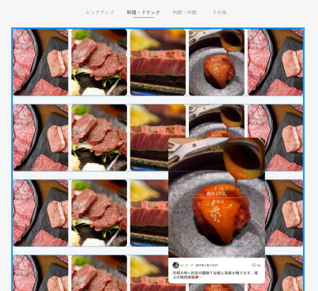 トップページでも画像ページでも投稿ページでも、ホバーしたときに出てくる要素を含む画像のコンポーネントで、下記画像のホバー前の並んでいる画像を表示するコンポーネントです。