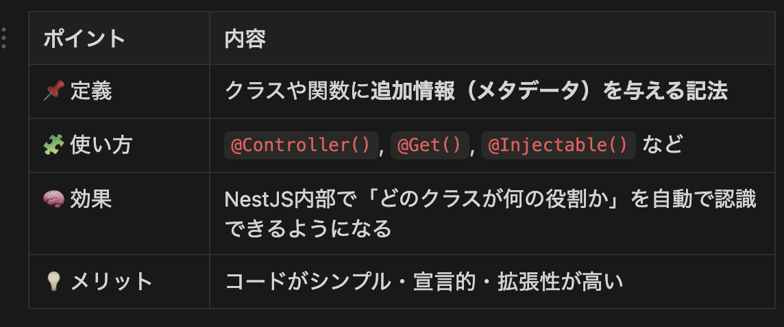 NestJSのデコレーターとは?@Controllerや@Injectableの意味と使い方を初心者向け
