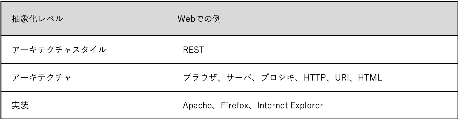 図1 は Web を「設計思想(REST など)」「仕組み(HTTP/URI など)」「実装(Apache/Chrome など)」の3つに分けています。