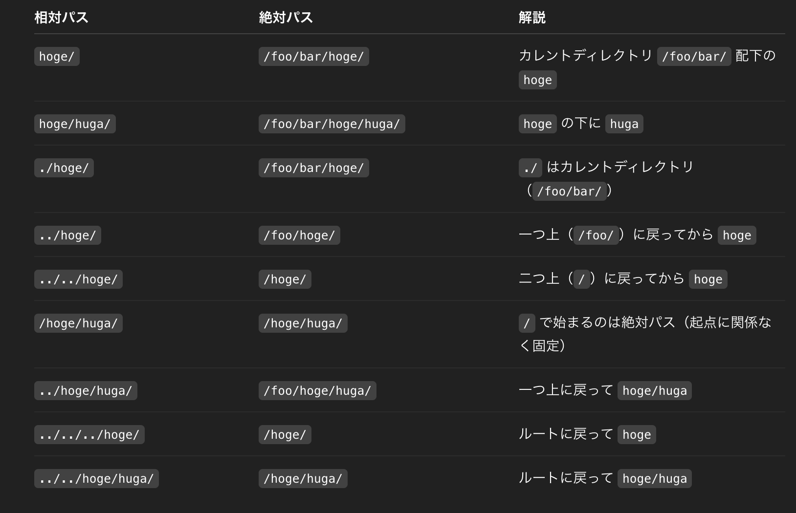 例えば、barディレクトリに現在いるとすると、表1の左側の相対パスは、それぞれ右側の絶対パスに対応します。