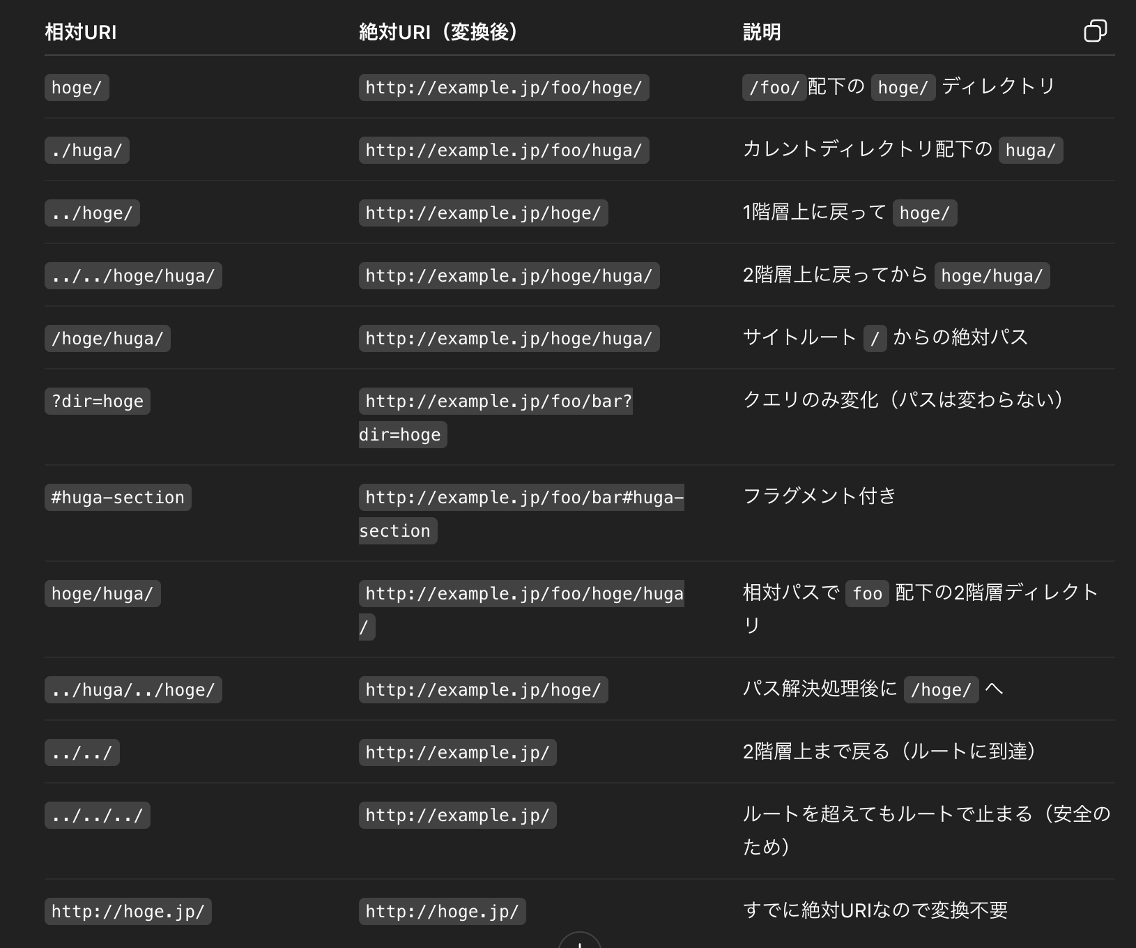 このように、相対パスを絶対パスに変換するためにはベースURIが必要となります。