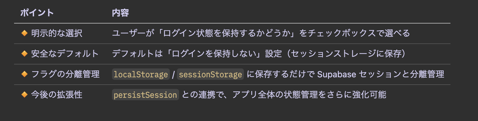 現在はログイン保持フラグをストレージに保存するだけの実装ですが、以下のような拡張も予定しています: