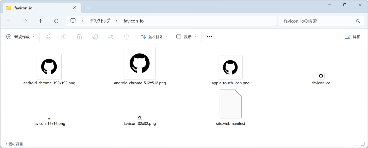 favicon_io.zip というファイルがダウンロードされるので、それを解凍してください。次のようなファイルが得られます。