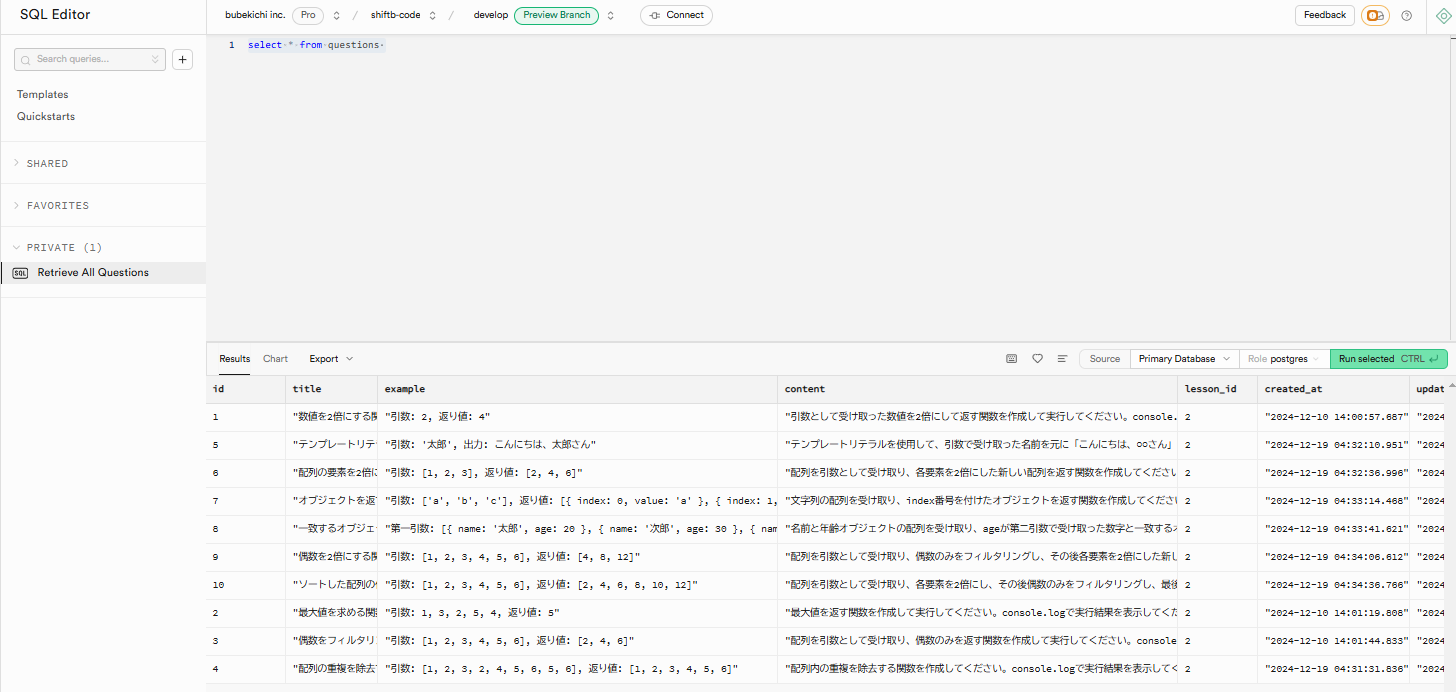 SQL文を記述する。今回はquestionsの全データが欲しかったので、