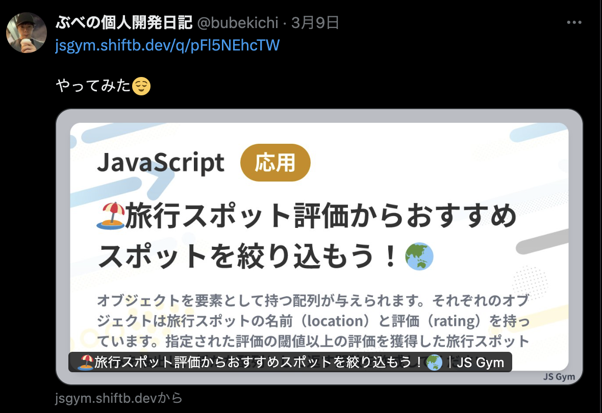 問題ページのURLをLINEやSlcakで送ったり、XやThreadsでシェアした時に、問題タイトルや本文が差し込まれた画像が表示されます。
