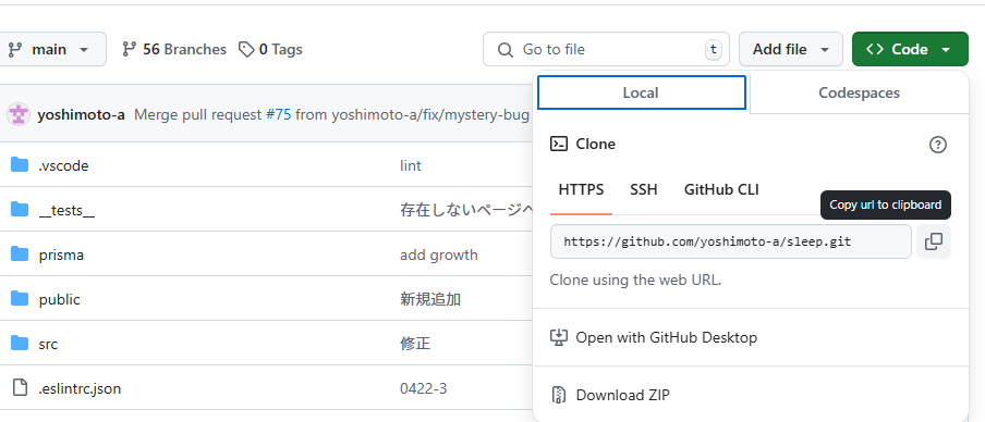 git clone リポジトリのURLURLの確認方法は緑のCodeボタン押して、URLコピーです。