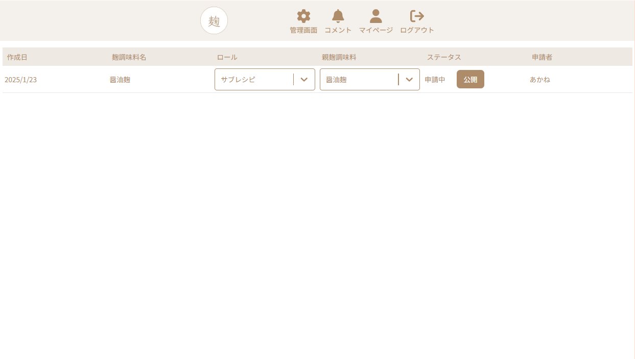 目的はadminユーザーが麹調味料の公開申請を承認するための画面です。