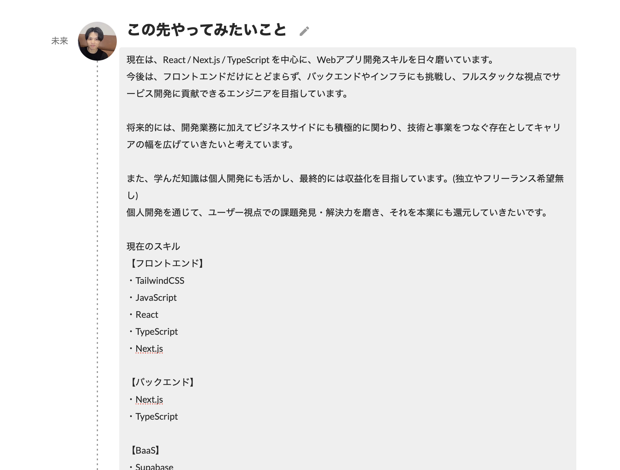個人開発を通じて、ユーザー視点での課題発見・解決力を磨き、それを本業にも還元していきたいです。
