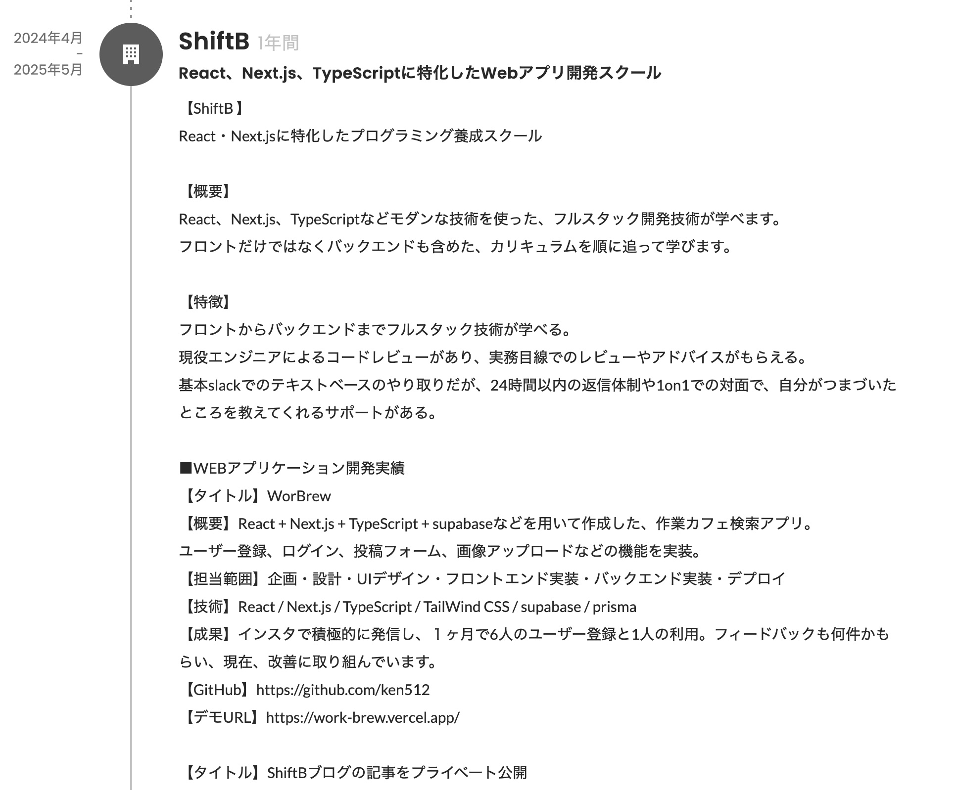 ShiftBで学んでいることは、経歴の欄には入れず、その代わり、実務実績の箇所で、スクールの説明も入れる。