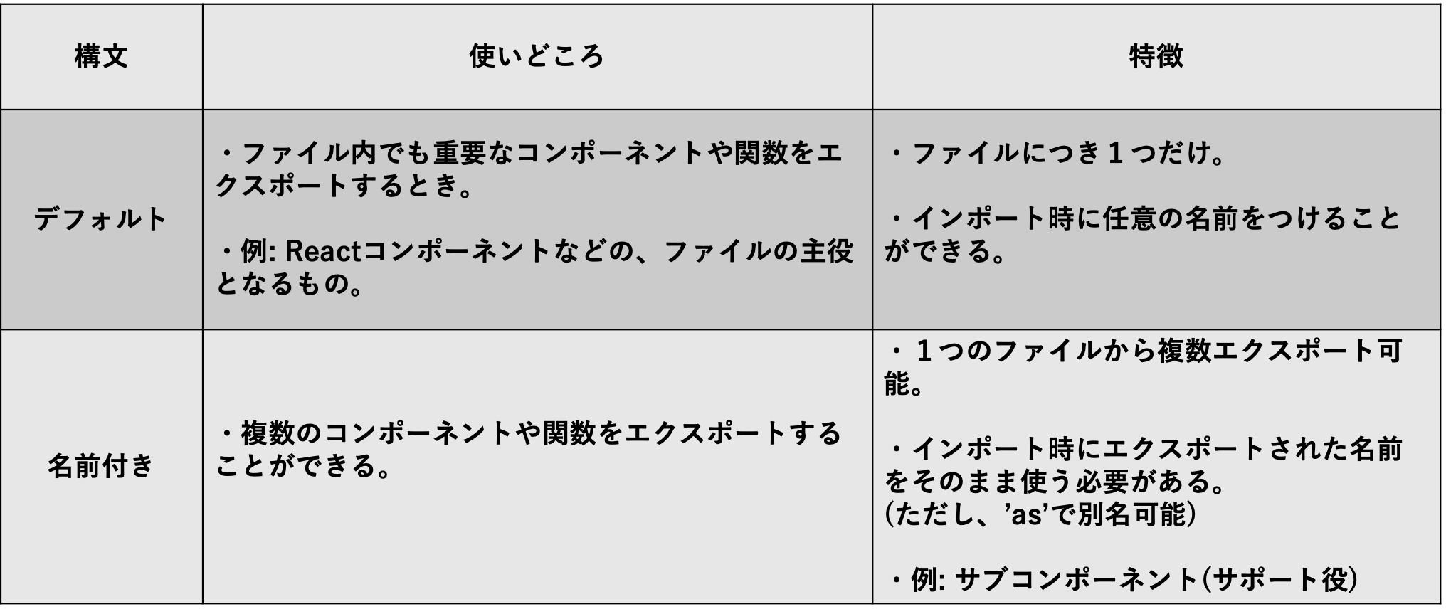 以下、デフォルトエクスポート(波括弧なし)と名前付きエクスポート(波括弧あり)の表です。