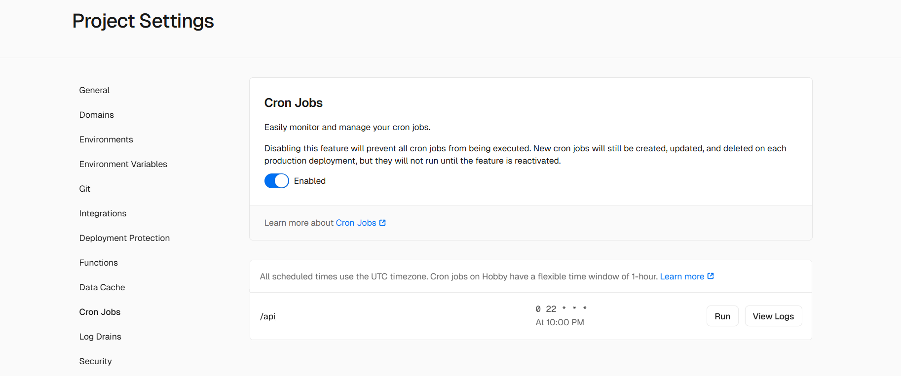 この内容でデプロイするとProject→Settings→Cron Jobsで設定できていることが確認できます!