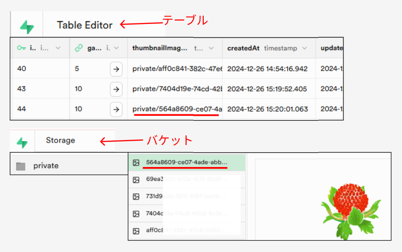 これにより、画像のメタデータはテーブルに、実体はバケットに保存されます!