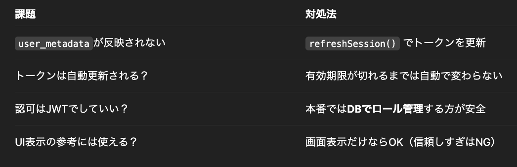 await supabase.auth.refreshSession();これで新しいJWTが発行され、user_metadataも最新になります。