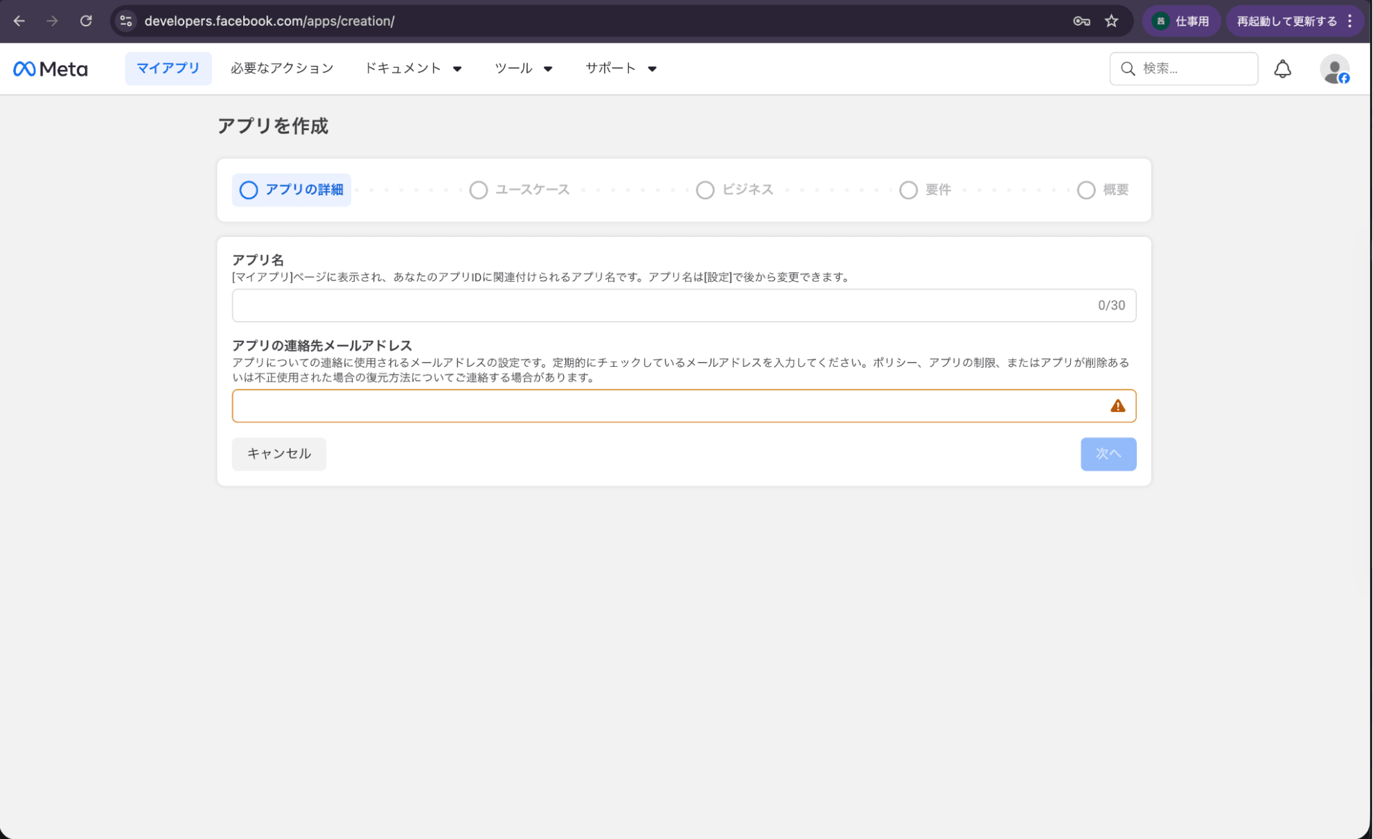 アプリ名とメールアドレスを埋めて、次へ