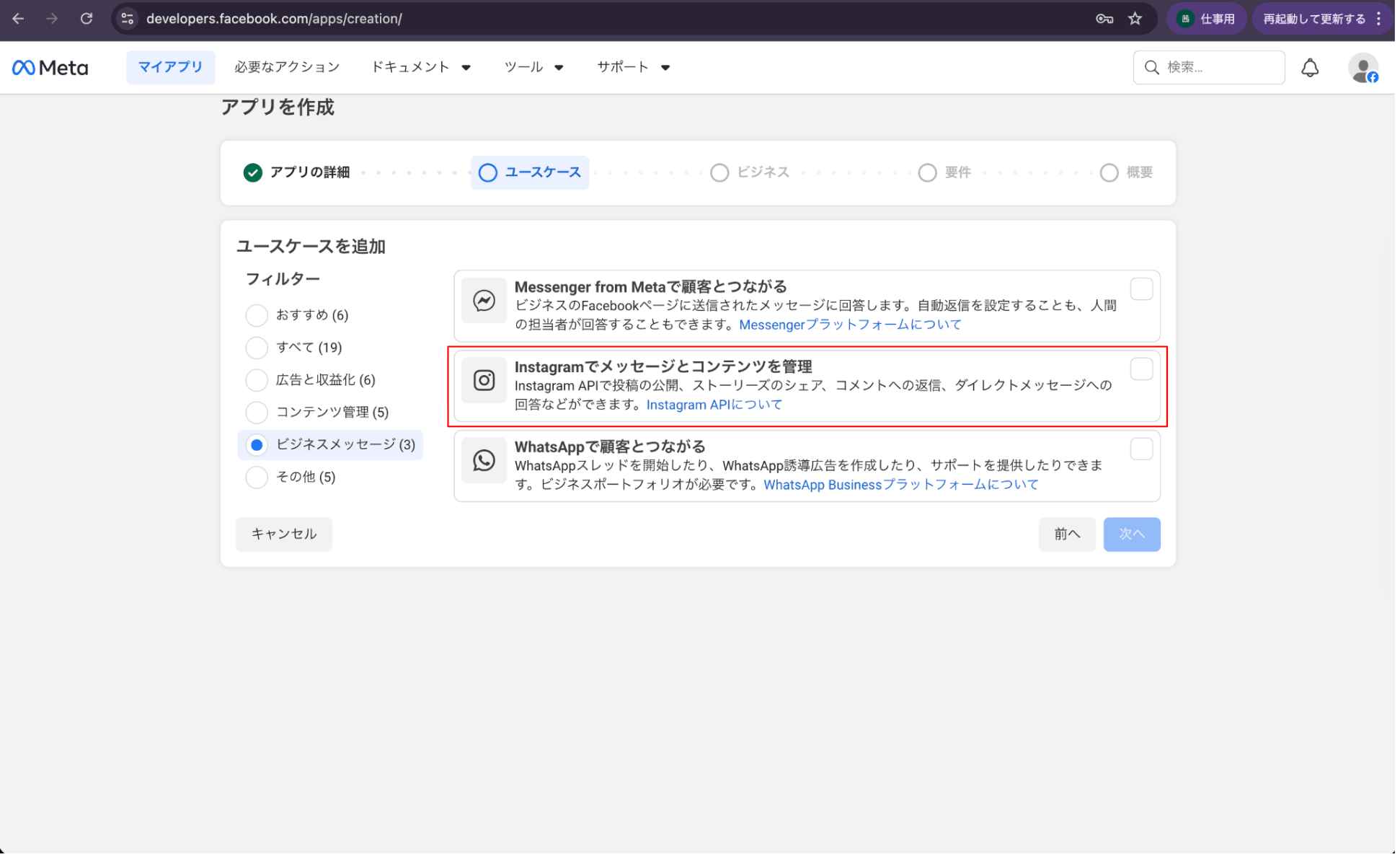 fillterは他のでも出てくるので適当にして「Instagramでメッセージとコンテンツを管理」を選択して、次へ