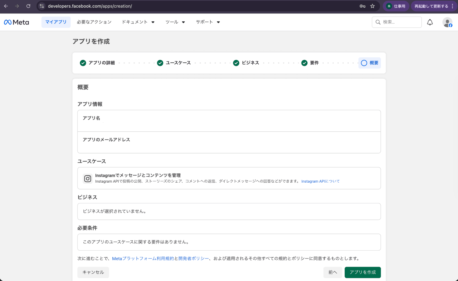 確認画面です。OK、「アプリを作成」クリック