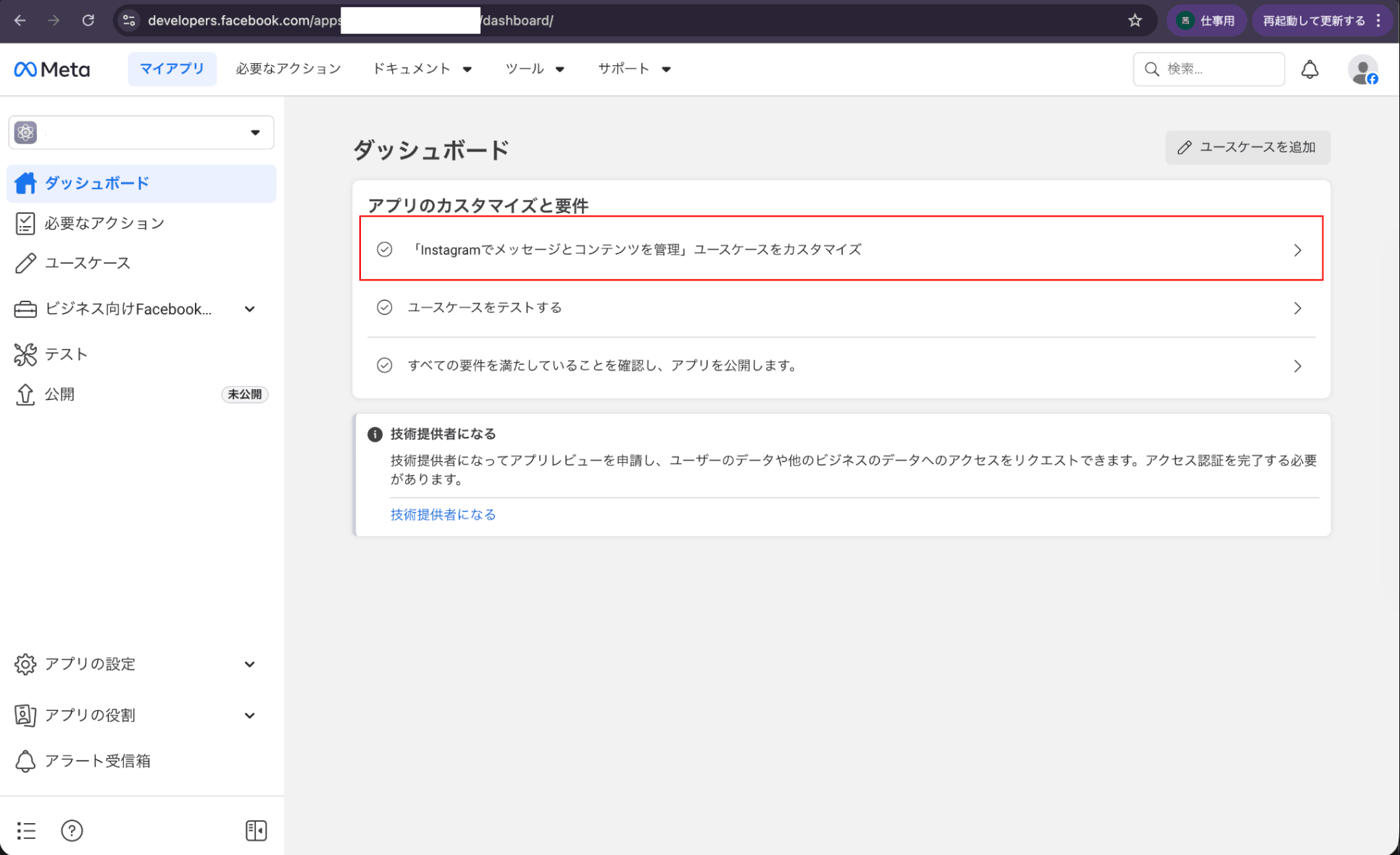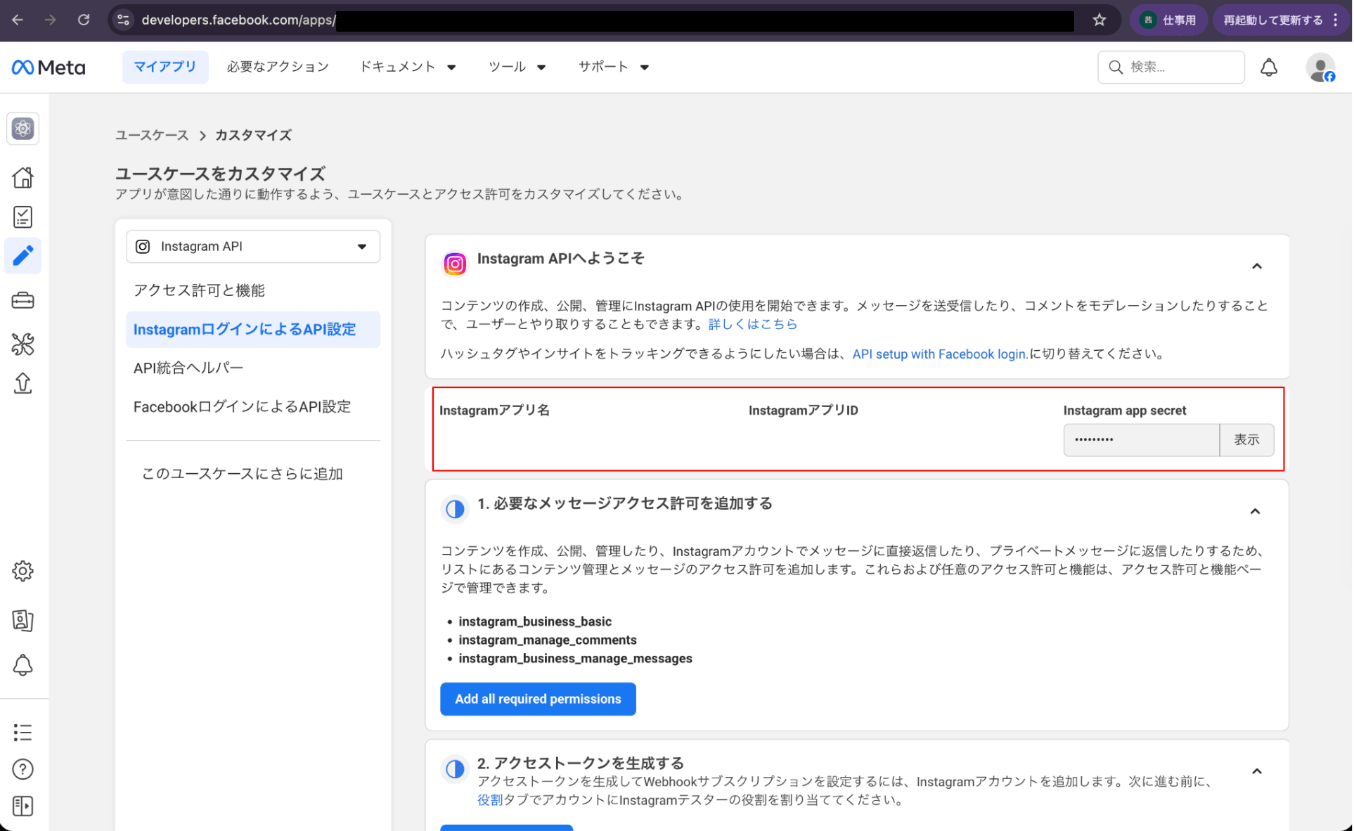 ダッシュボード→ アプリのカスタマイズと要件 → 「Instagramでメッセージとコンテンツを管理ユースケースをカスタマイズ」をクリック