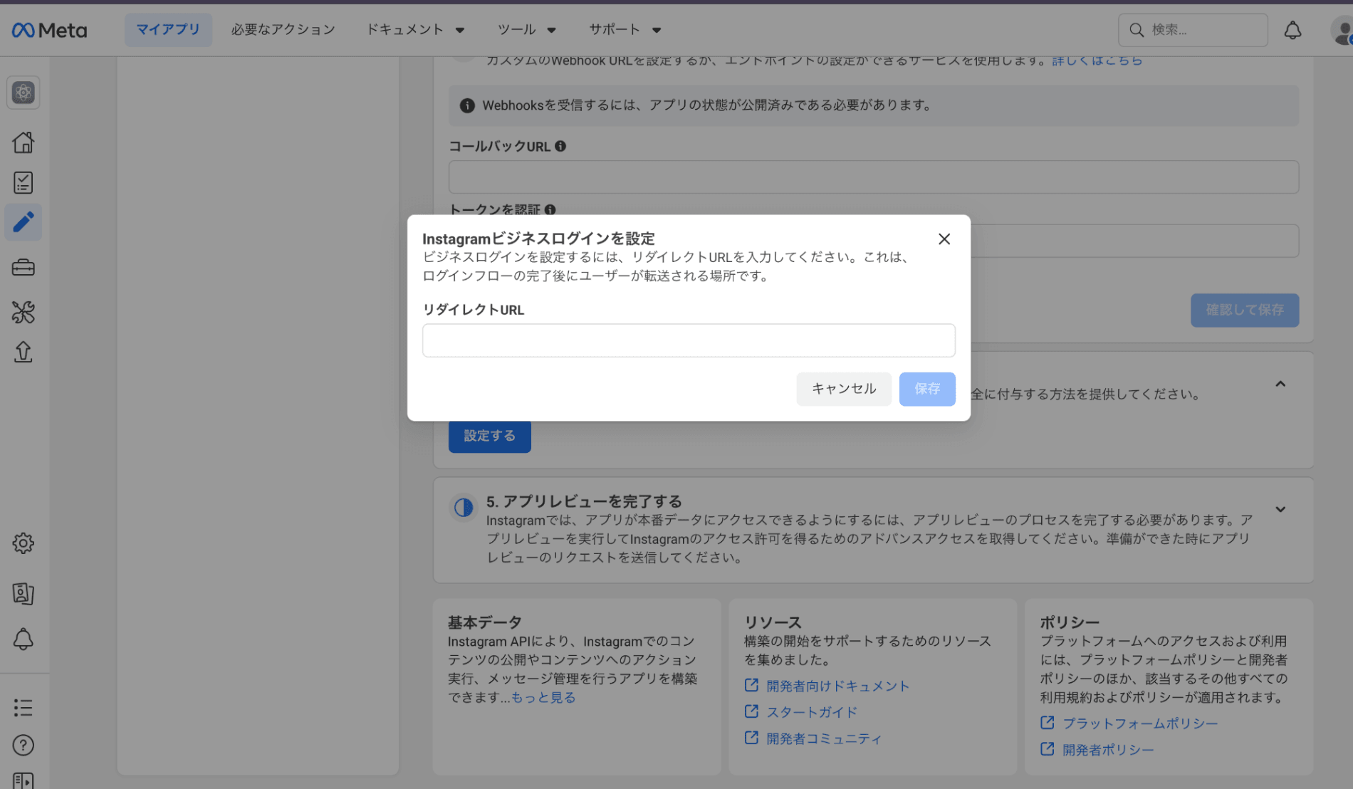 モーダルが開くので、ここでInstagram認証成功後のコールバックURLを設定します。