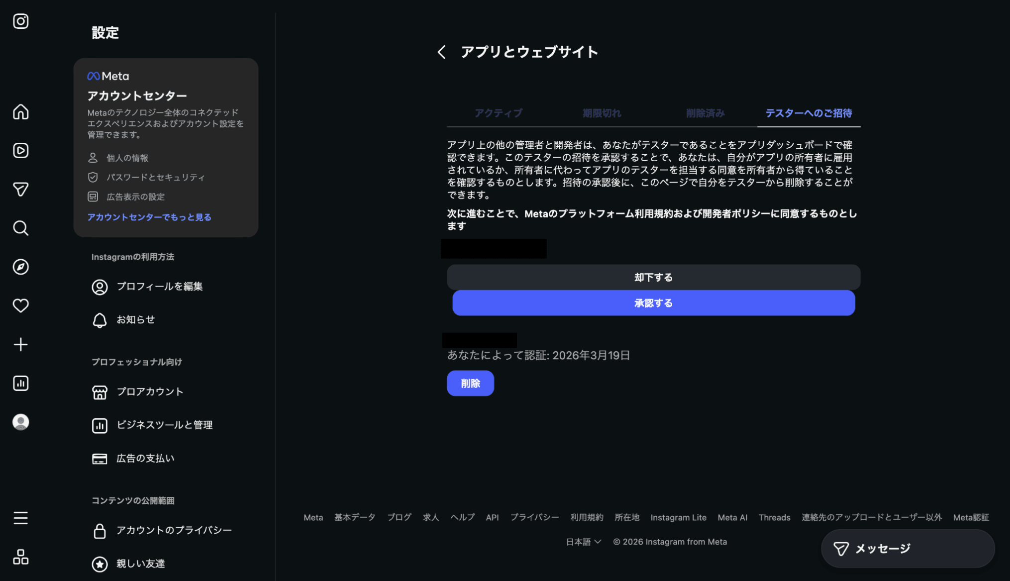 Instagramの設定 →アプリとウェブサイトへのアクセス許可→アプリとウェブサイト