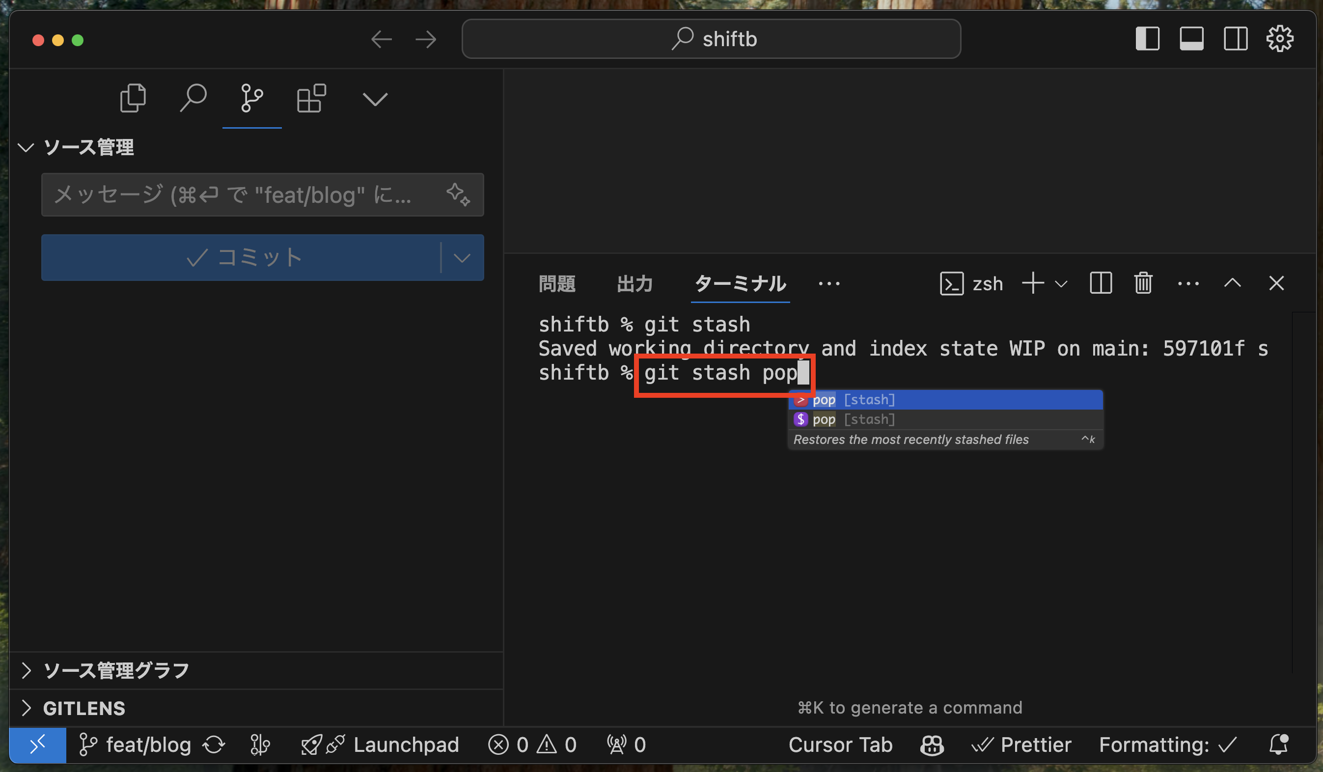 ↓git stash popコマンドを打ちます。