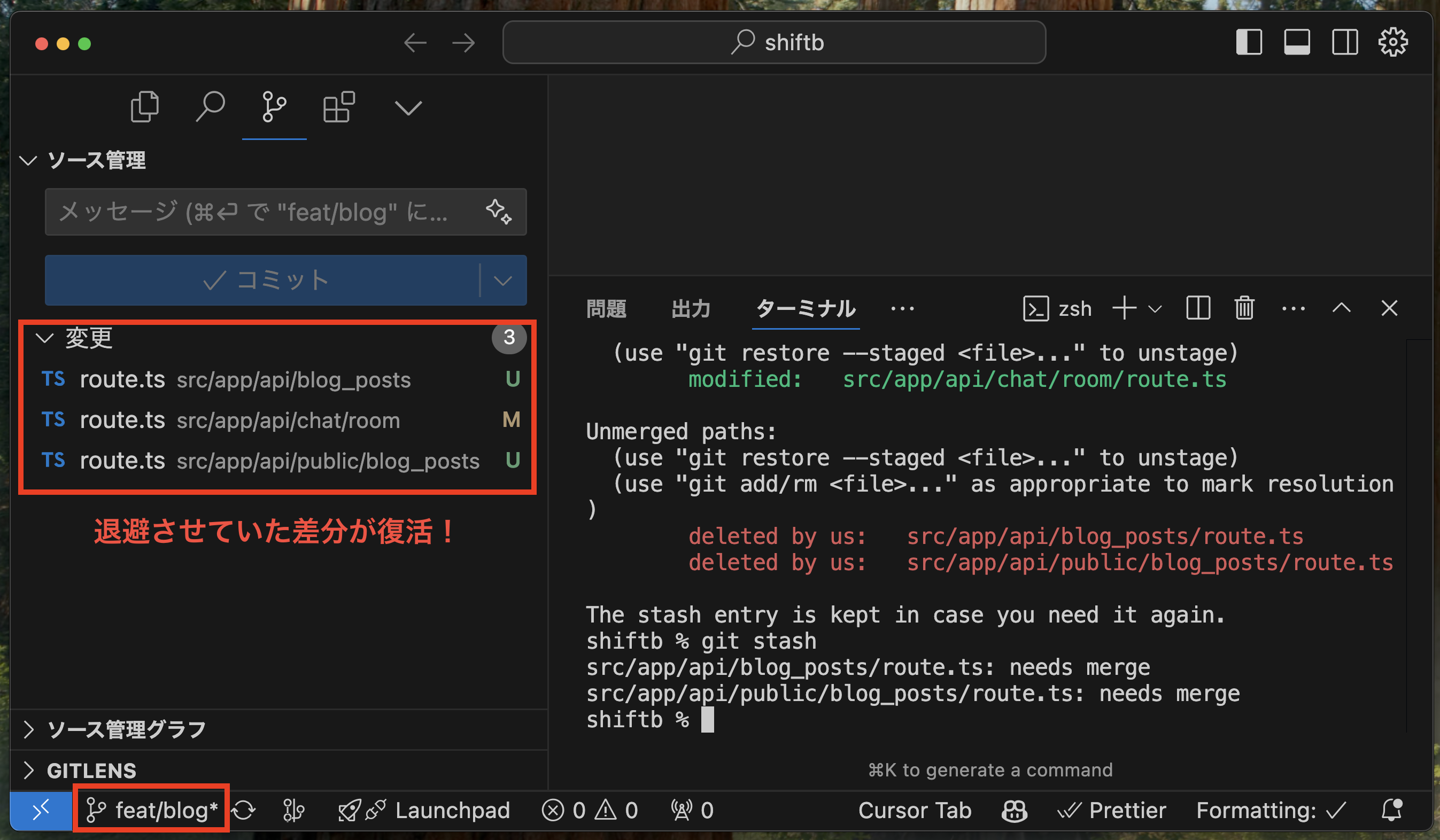 これで、feat/blogブランチに差分を移動させることができました。