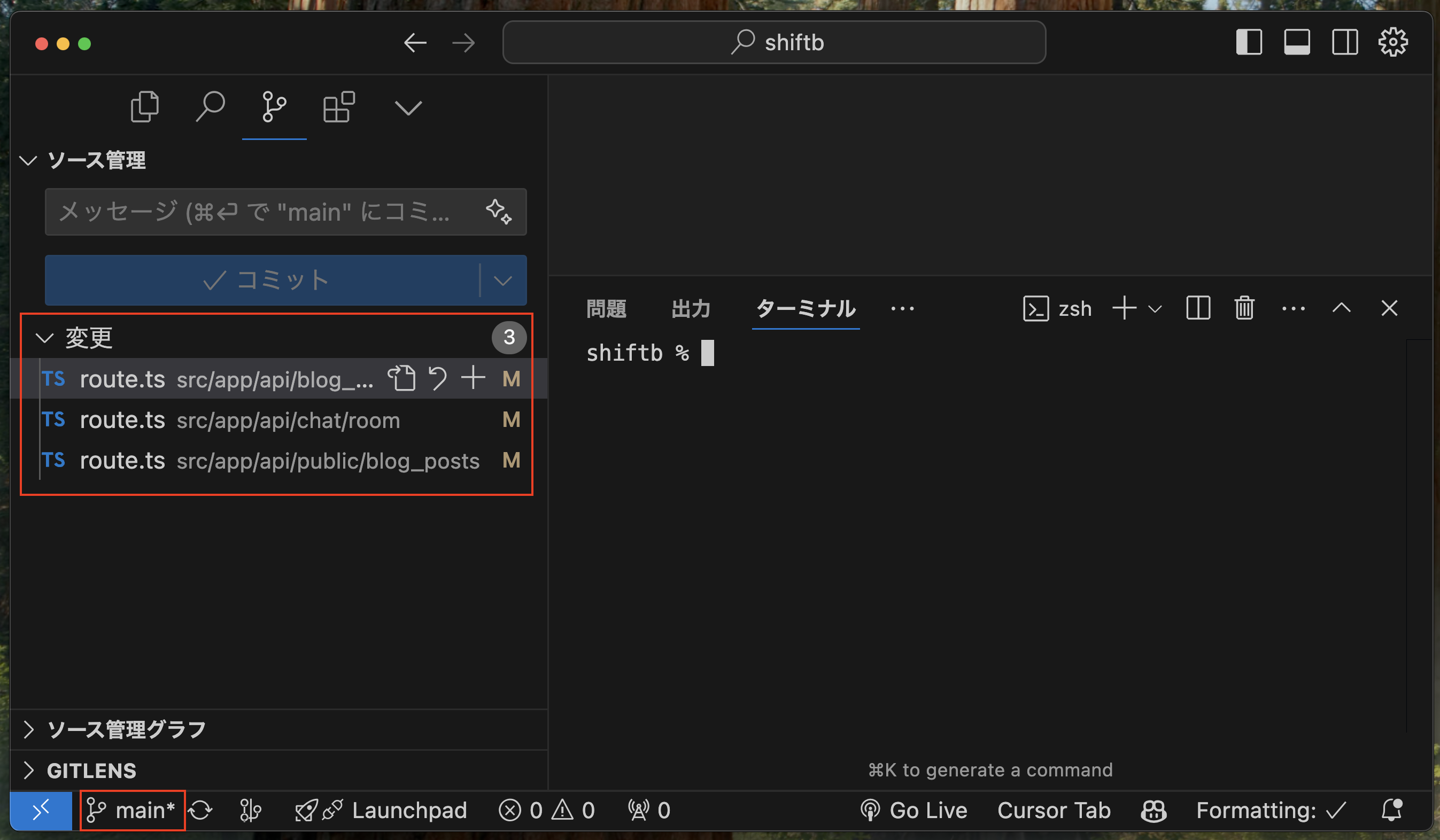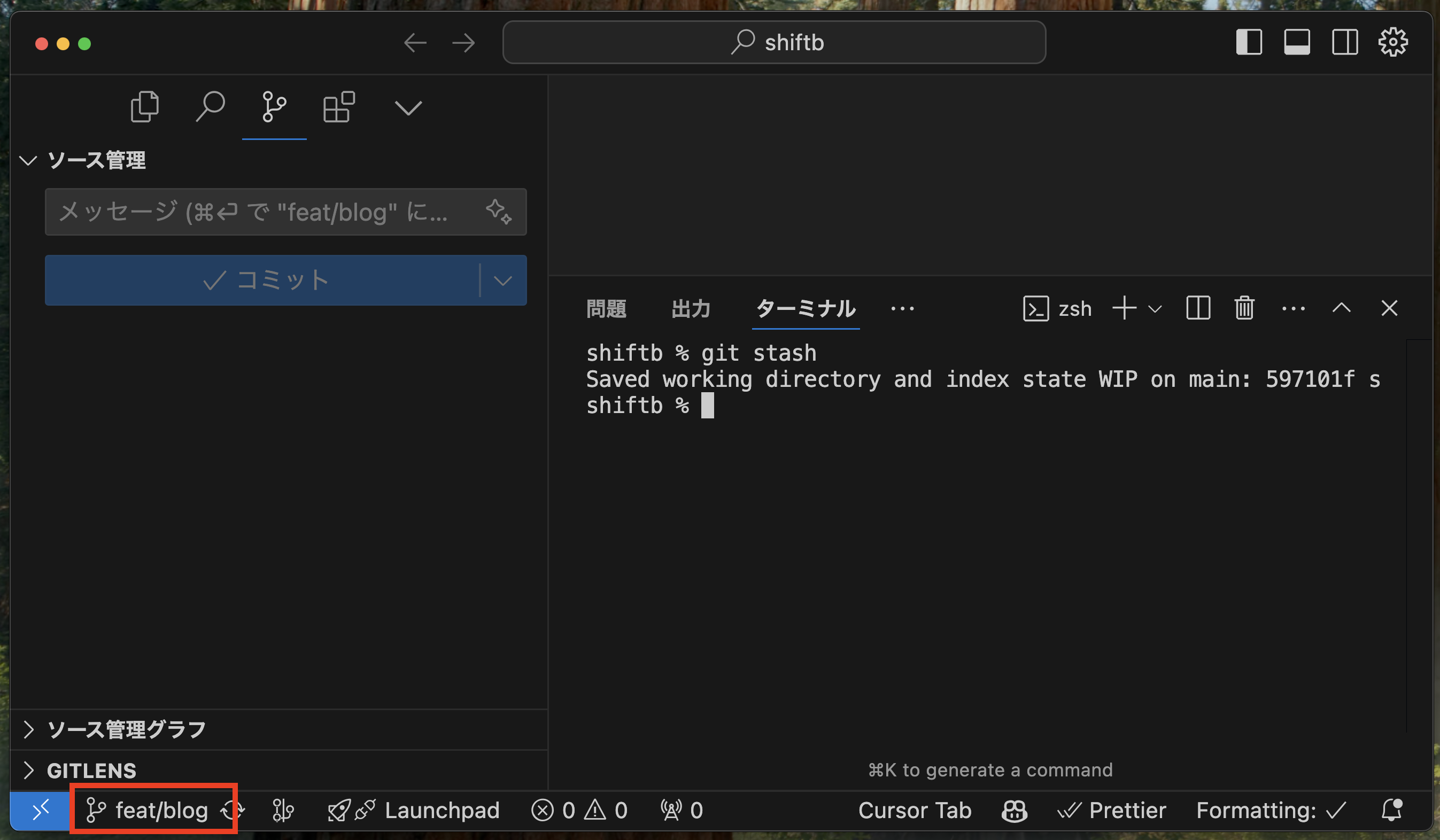 ↓ 例として、feat/blogブランチで作業したかったのに、mainブランチで差分を加えてしまったとします。
