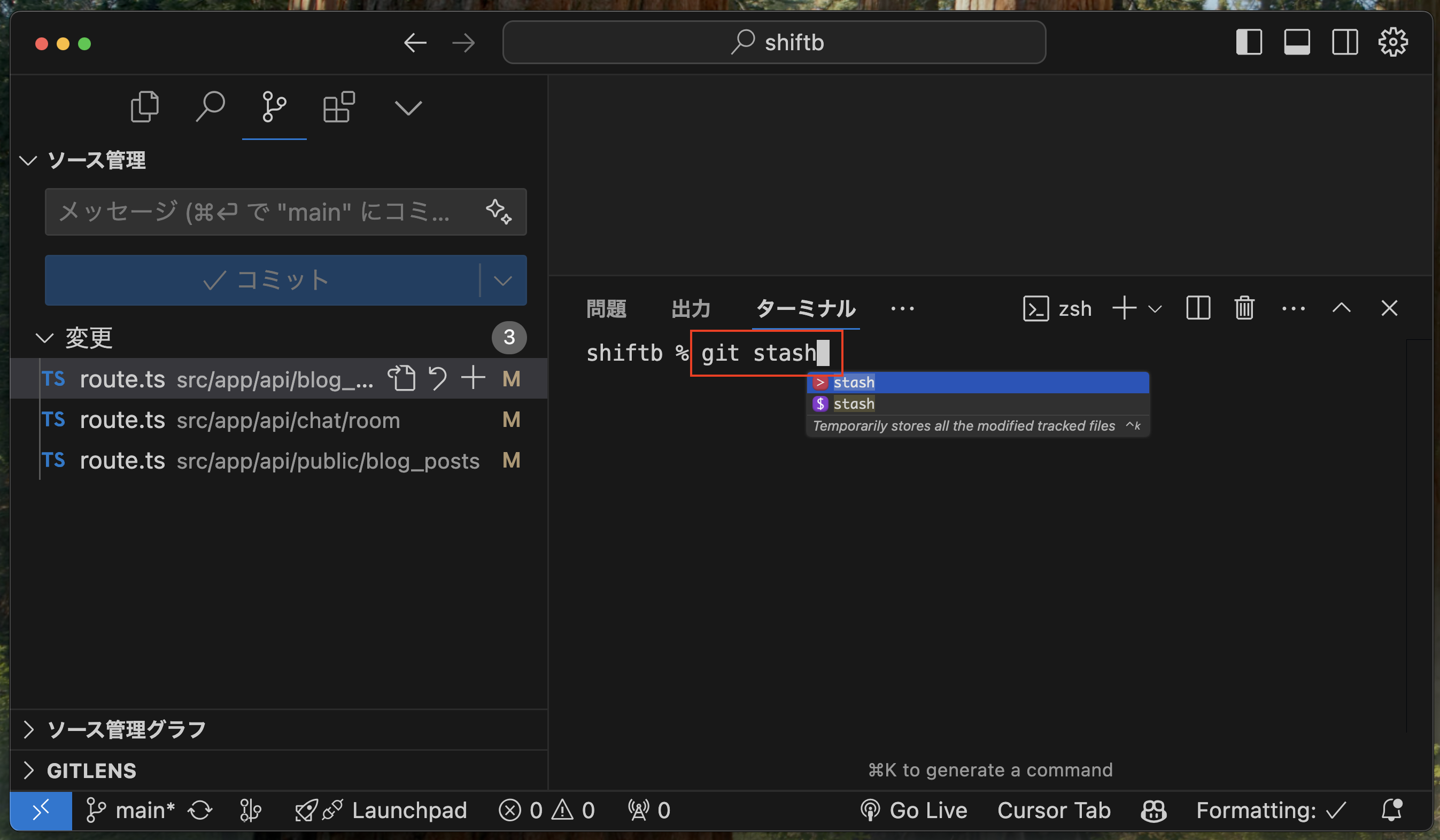 ↓git stashコマンドを打ちます。