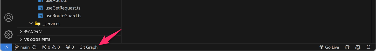 インストール完了後、ウィンドウ下部のステータスバーに「Git Graph」アイコンが追加されます。このアイコンをクリックしてください。
