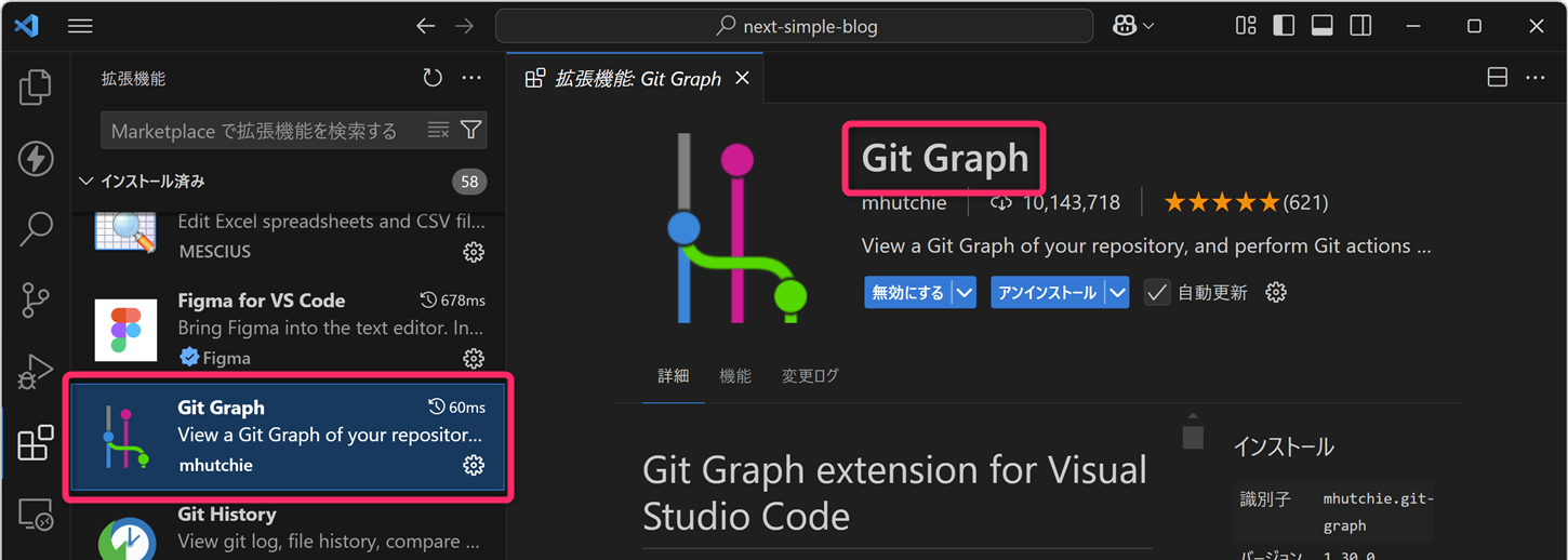 ここでは、VSCode の拡張機能「Git Graph」を使った方法を紹介したいと思います。Git Graph はコミット履歴をグラフィカルに表示し、ブランチの分岐やマージの関係を視覚的に把握できる拡張機能ですが、今回は差分表示機能を利用していきます。まずは、Git Graph をインストールします。