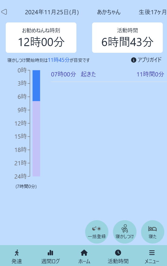この流れで寝かしつけに苦戦するパターン少なくないので、最初はアプリ内の活動時間の目安を元に寝かしつけてみた方がいいと思います。