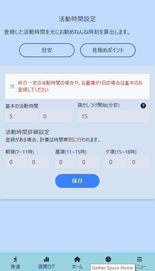 登録を元に計算しますので、ある程度我が子の活動時間を知っていないとただの記録アプリになります。